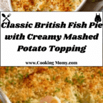 A comforting British-style fish pie featuring mixed white fish in a creamy white sauce with peas and diced vegetables, topped with fluffy buttery mashed potatoes and baked to a golden finish.